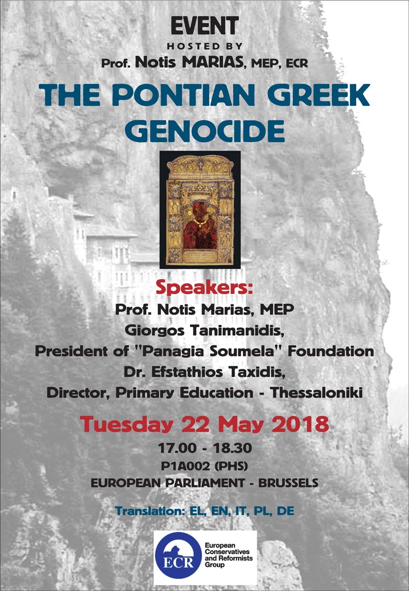 Εκδήλωση Τιμής και Μνήμης για τη Γενοκτονία των Ελλήνων του Πόντου διοργανώνει στο Ευρωπαϊκό Κοινοβούλιο στις Βρυξέλλες ο Πρόεδρος του Κόμματος «ΕΛΛΑΔΑ-Ο ΑΛΛΟΣ ΔΡΟΜΟΣ» Ευρωβουλευτής, Καθηγητής Νότης Μαριάς την Τρίτη 22 Μαΐου στις 17:00, με στόχο να αρχίσει η διαδικασία προκειμένου να πετύχουμε επιτέλους την αναγνώριση από το Ευρωπαϊκό Κοινοβούλιο της Γενοκτονίας των Ελλήνων του Πόντου.